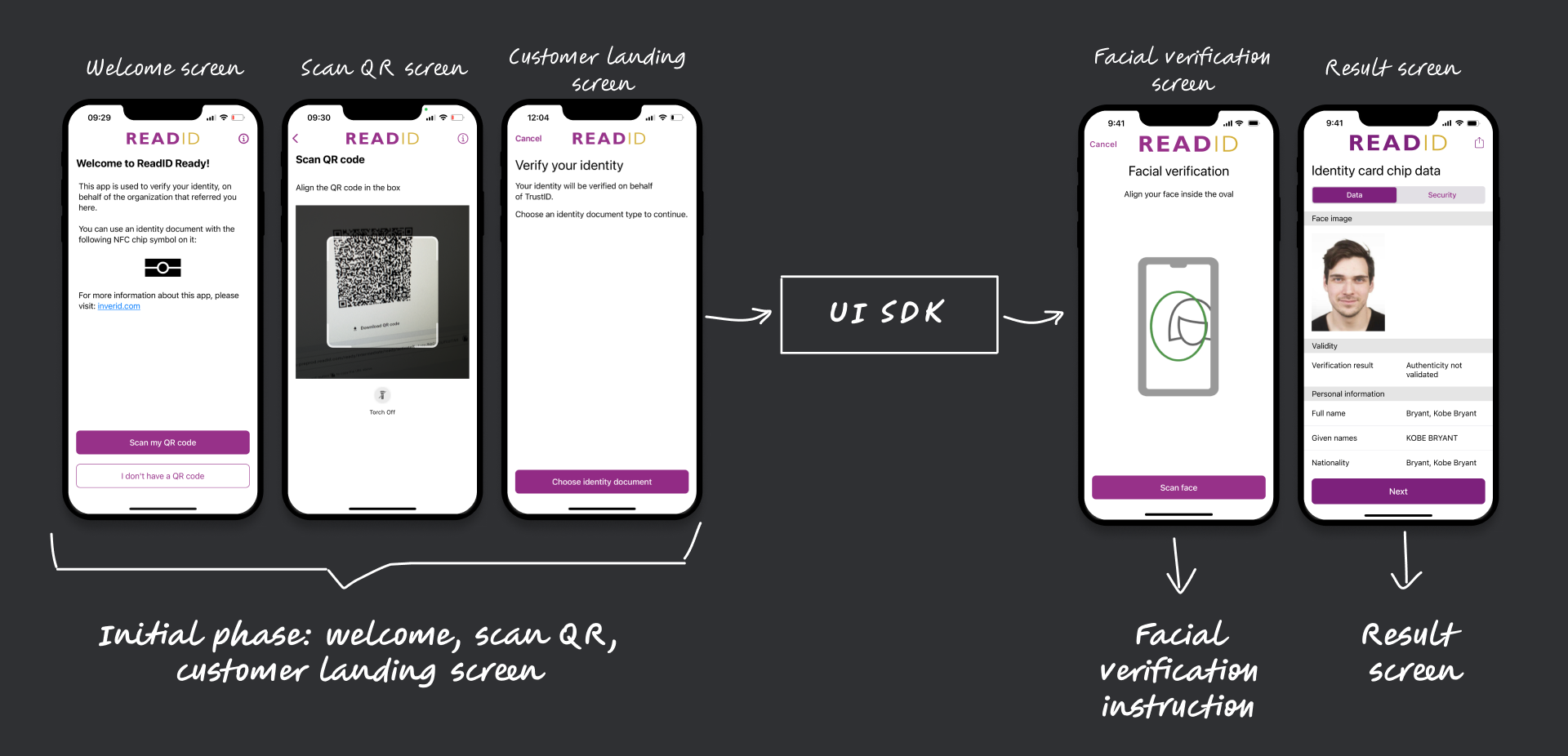 The facial verification instruction screen and result screen