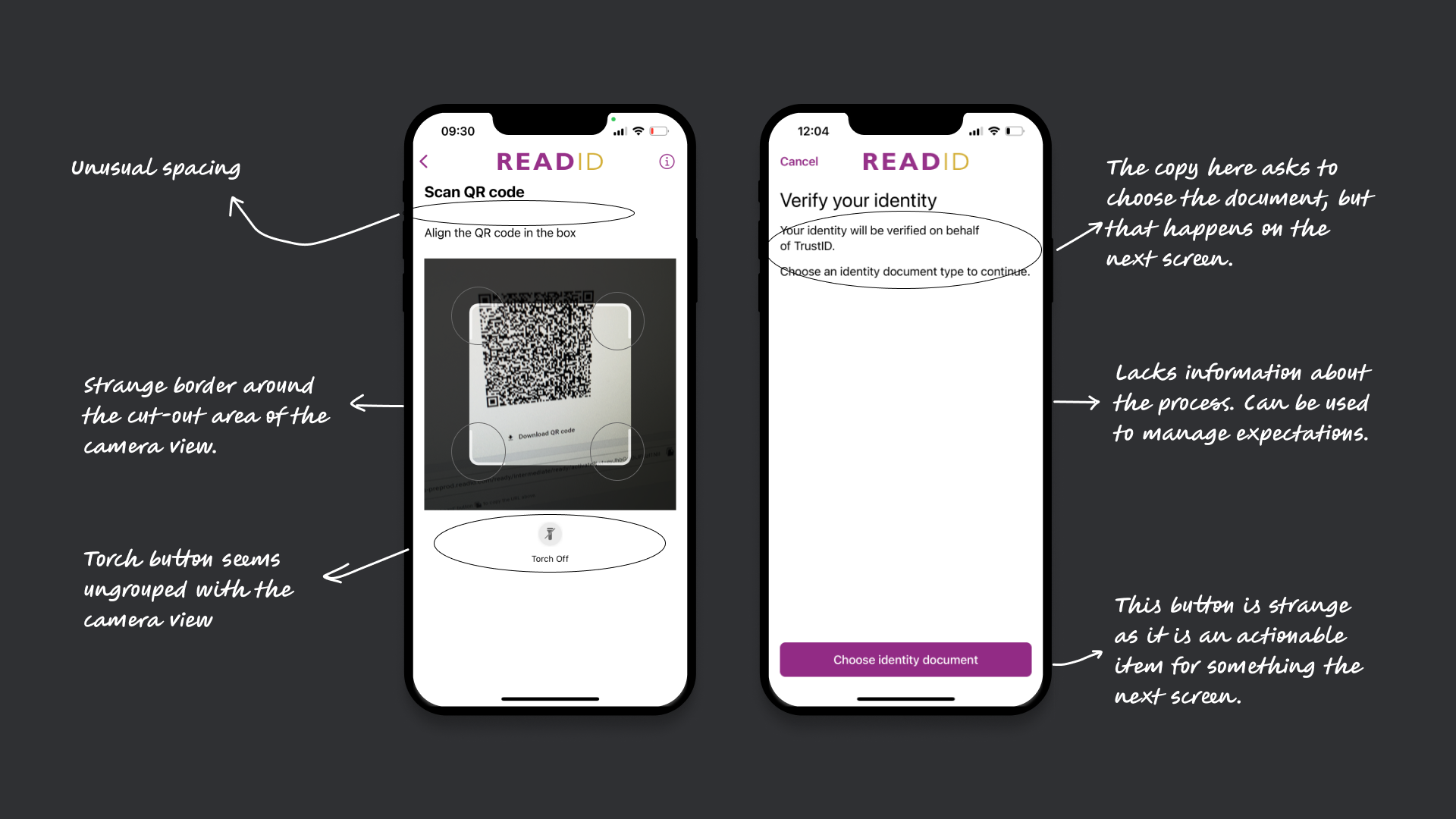 The scan QR code screen is meant to link users to the referring client via a QR code. However, there are UI issues: inconsistent spacing between title and text, a non-standard camera view with an odd border, and a torch button that feels disconnected from the camera interface.