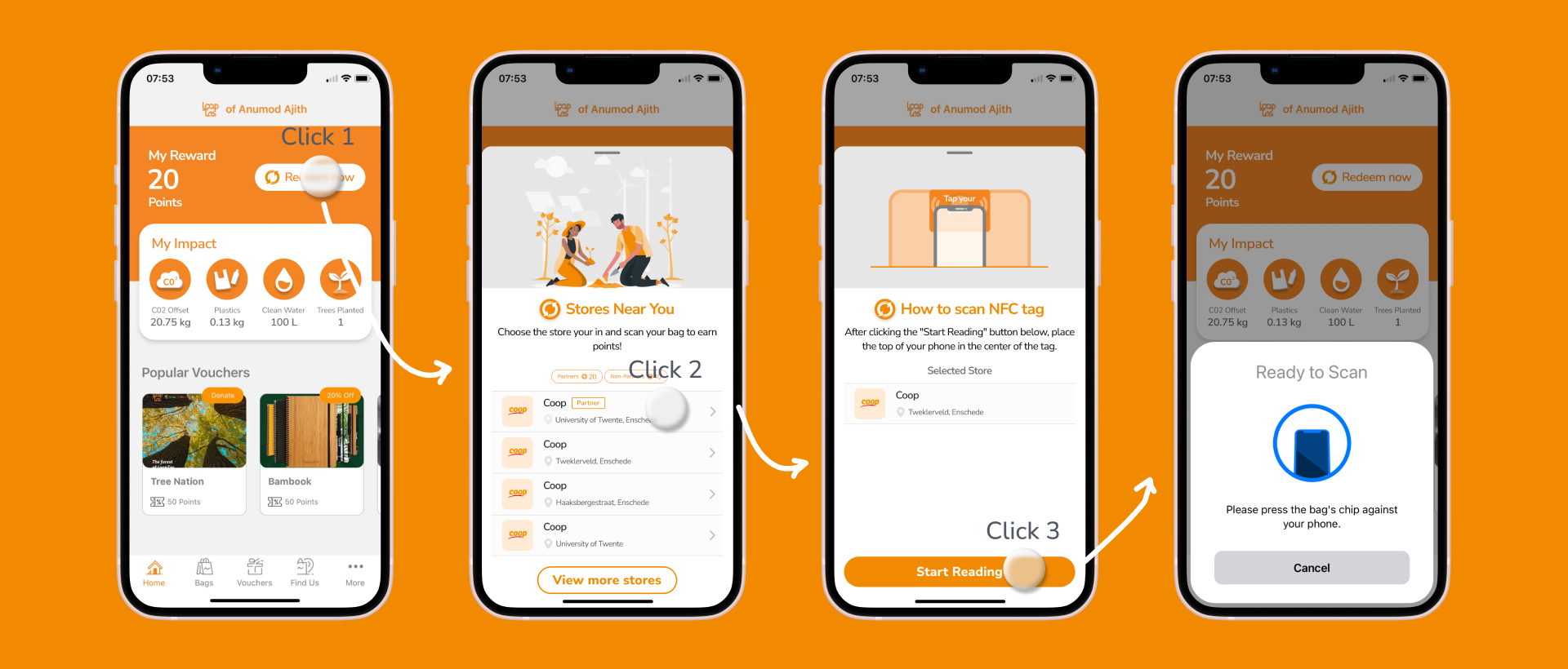 Click 3: Triggers the phone's NFC reading feature to scan the bag’s chip and confirm reuse.