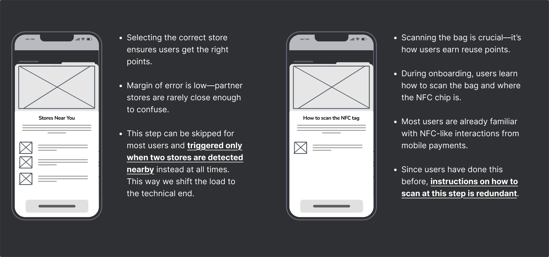 Our goal was to make reusing the bag as effortless as possible—ideally just a single tap. But achieving that meant carefully managing technical limitations and preventing misuse, without compromising the user experience.